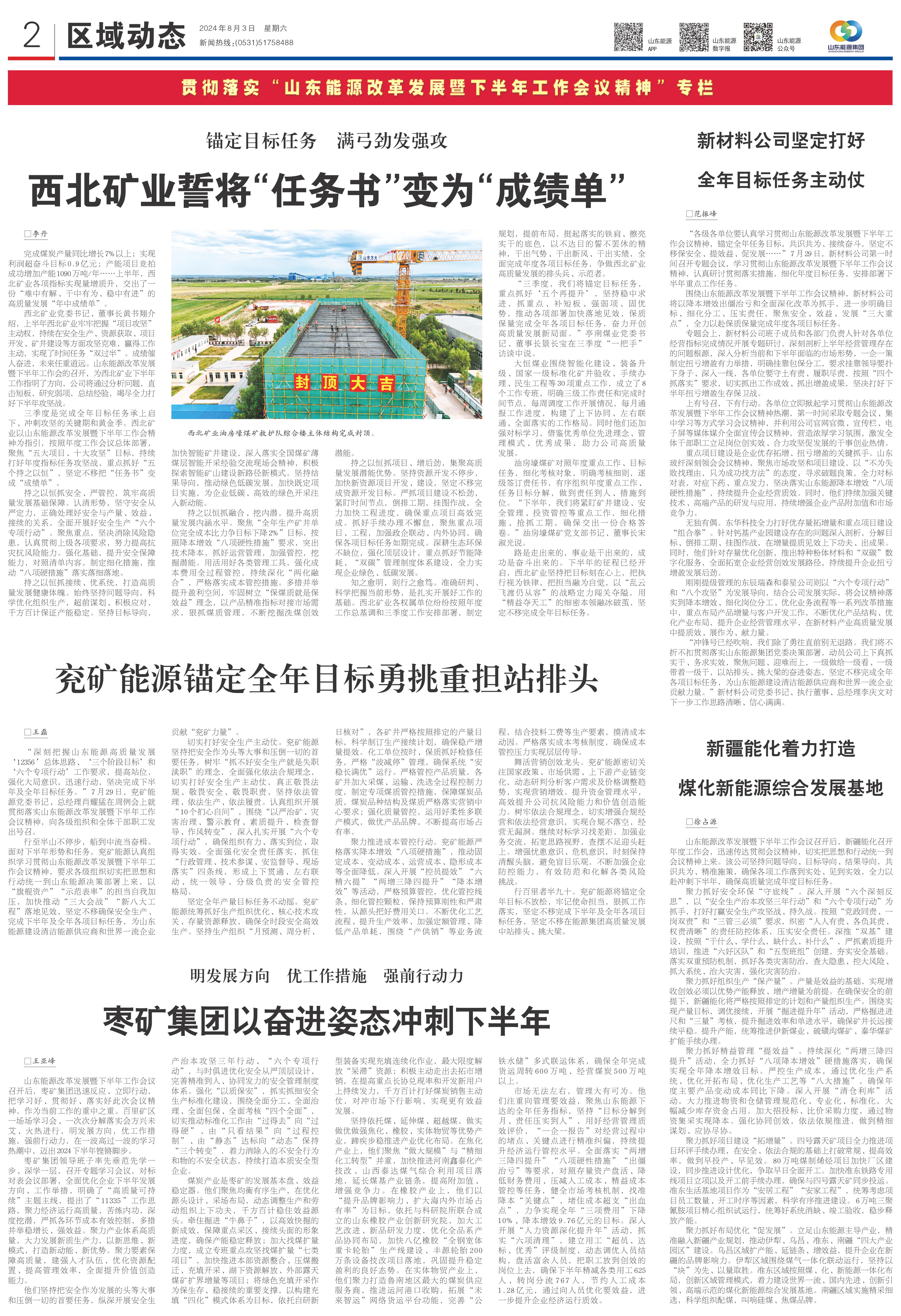 聚力抓好布局优化“促发展”。立足山东能源主导产业,精准融入新疆产业规划,推动伊犁、乌昌、准东、南疆“四大产业园区”建设。乌昌区域扩产能、延链条、增效益,提升企业在新疆的品牌影响力。伊犁区域围绕煤气一体化联动运行,坚持以“块”为先、以量取胜。准东区域按照煤、化、新能源一体化布局,创新区域管理模式,着力建设世界一流、国内先进、创新引领、高端示范的煤化新能源综合发展基地。南疆区域实施精采细选,科学组织配煤,叫响硅煤、焦煤品牌。