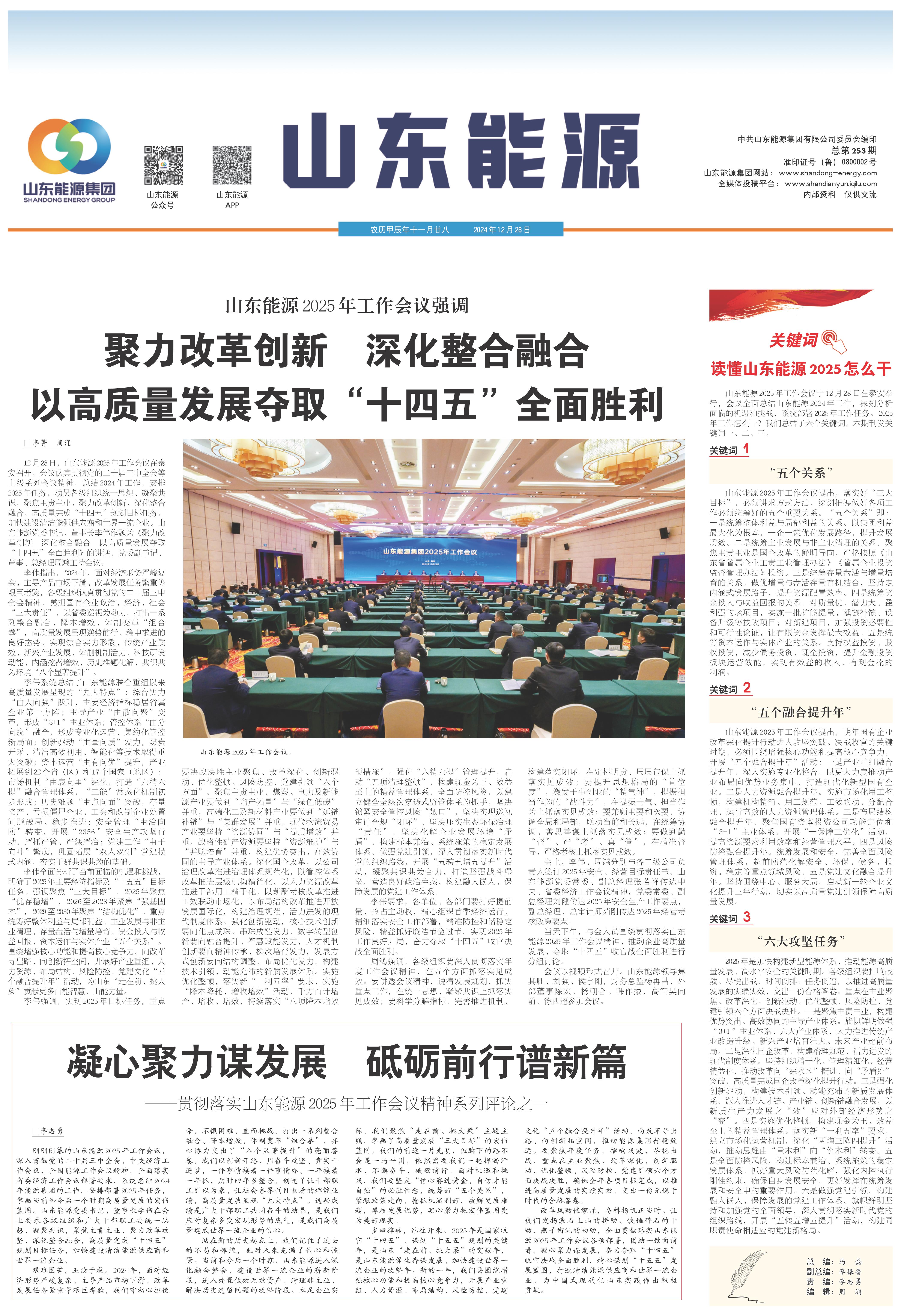 12月28日,山东能源2025年工作会议在泰安召开。会议认真贯彻党的二十届三中全会等上级系列会议精神,总结2024年工作,安排2025年任务,动员各级组织统一思想、凝聚共识,聚焦主责主业、聚力改革创新、深化整合融合,高质量完成“十四五”规划目标任务,加快建设清洁能源供应商和世界一流企业。山东能源党委书记、董事长李伟作题为《聚力改革创新深化整合融合以高质量发展夺取“十四五”全面胜利》的讲话,党委副书记、董事、总经理周鸿主持会议。