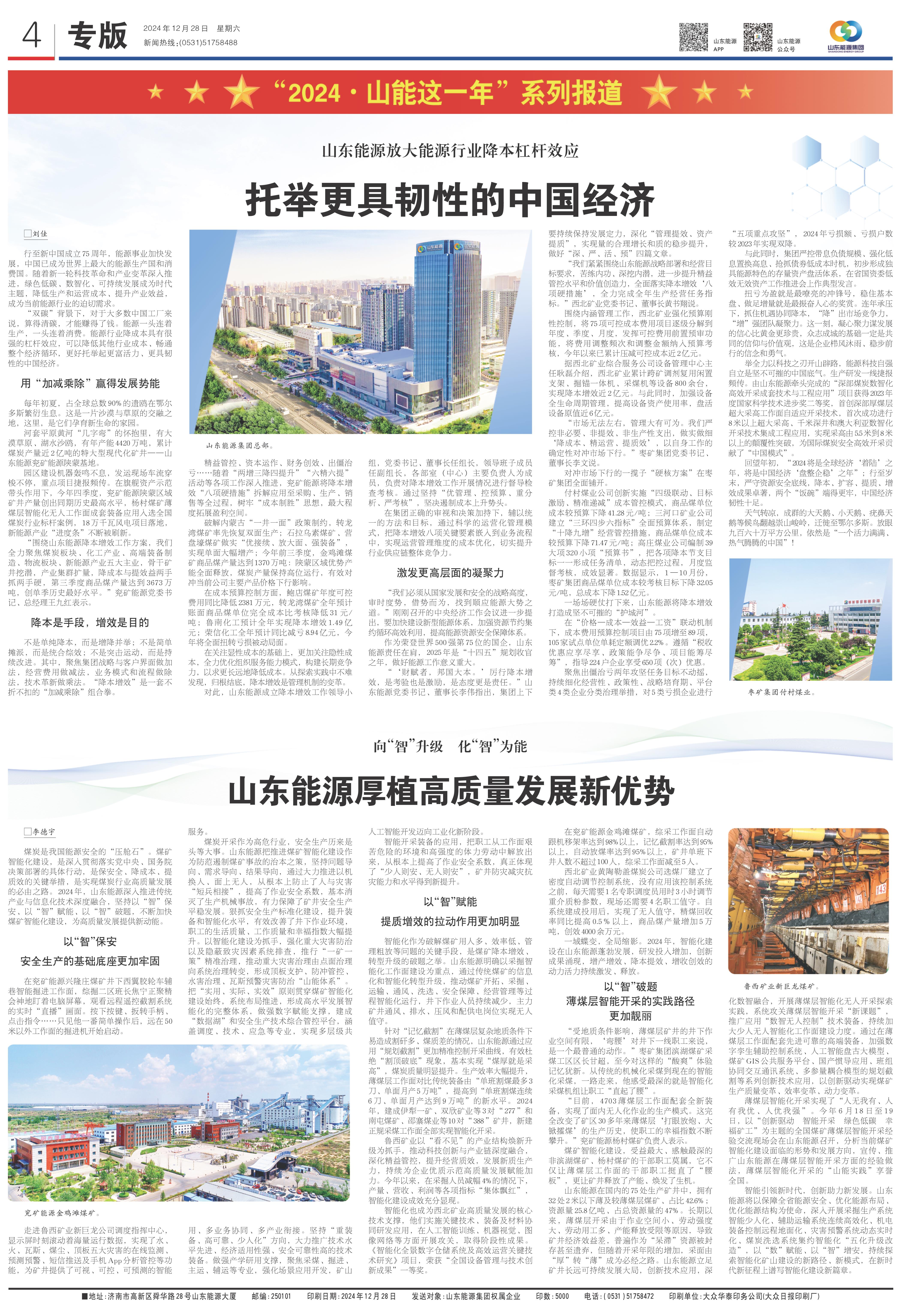 煤炭是我国能源安全的“压舱石”。煤矿智能化建设,是深入贯彻落实党中央、国务院决策部署的具体行动,是保安全、降成本、提质效的关键举措,是实现煤炭行业高质量发展的必由之路。2024年,山东能源深入推进传统产业与信息化技术深度融合,坚持以“智”保安、以“智”赋能、以“智”破题,不断加快煤矿智能化建设,为高质量发展提供新动能。