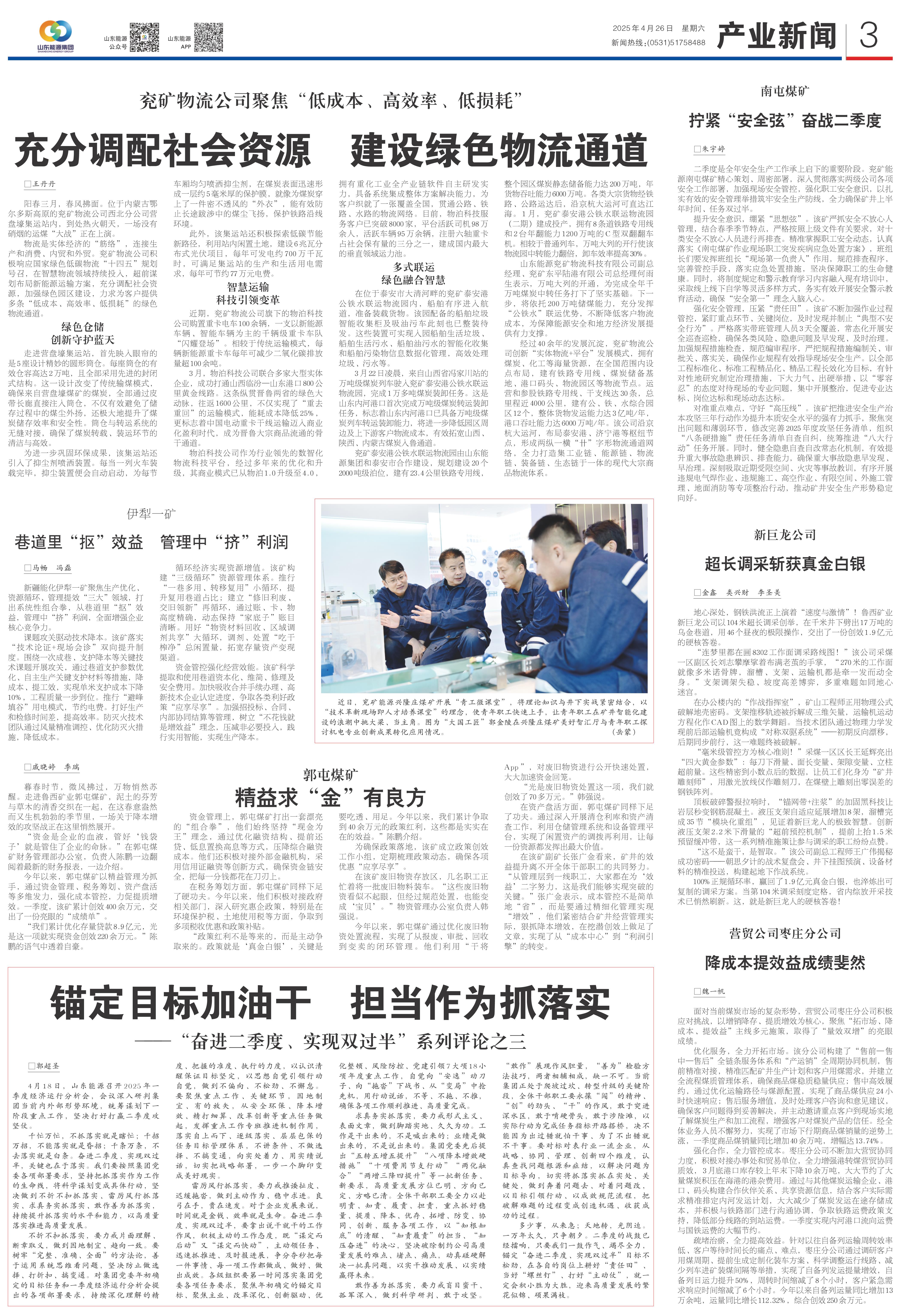 循环经济实现资源增值。该矿构建“三级循环”资源管理体系。推行“一巷多用、转移复用”小循环,提升复用巷道占比;建立“修旧利废、交旧领新”再循环,通过账、卡、物高度精确,动态保持“家底子”账目清晰。用好“物资材料回收、区域调剂共享”大循环,调剂、处置“吃干榨净”总闲置量,拓宽存量资产变现渠道。